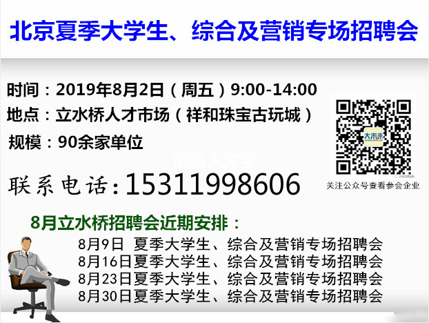 為促進北京市人才就業(yè),搭建就業(yè)服務(wù)平臺,促進北京地區(qū)人群高校專科、本科、研究生以及社會人群充分就業(yè),特在立水橋舉辦大型招聘會。歡迎貴單位參會招聘人才,為您的企業(yè)發(fā)展補充優(yōu)秀人才!