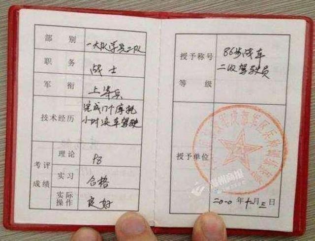 我們只知道開車要駕駛證,其實駕駛坦克也是要坦克駕駛證的!坦克駕駛證屬于“結(jié)業(yè)證”,是由中國人民解放軍授予的裝甲兵專業(yè)技術(shù)等級證書,軍人某項專業(yè)技術(shù)的經(jīng)歷、考評和等級等內(nèi)容都在上面得到體現(xiàn)。