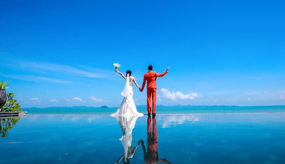 夫妻保持一定的距離,完全用眼神進行聯(lián)系溝通。當然,也可令雙方互相伸手相牽,若即若離,戀戀不 舍,中間的情絲宛若可見,產(chǎn)生距離的美感。當然也含有千里因緣一線牽的韻味。該式距離是關鍵。