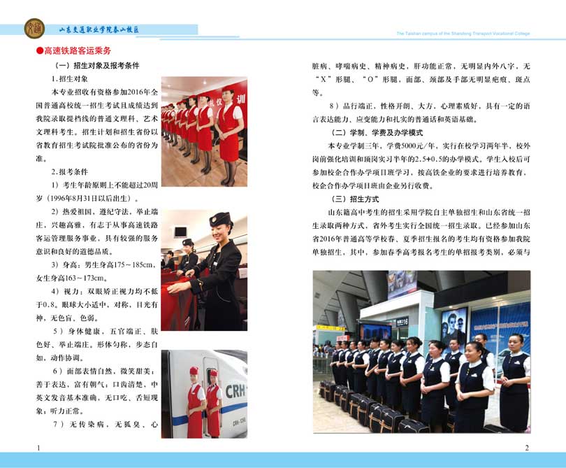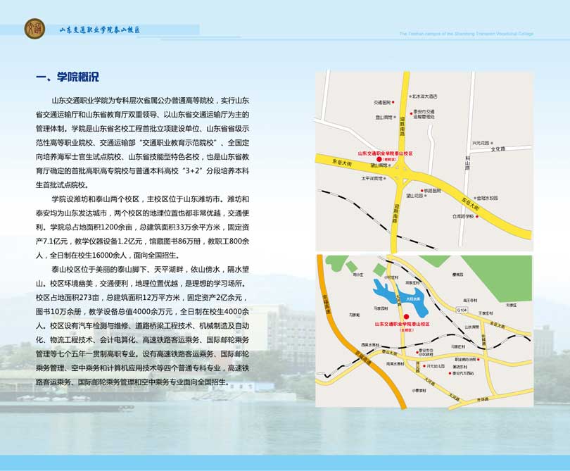 山東交通職業(yè)學院創(chuàng)建于1973年,是山東省交通運輸廳直屬的公辦全日制普通高等學校,實行山東省交通運輸廳和山東省教育廳雙重領導的管理體制。學院總占地面積1300余畝,總建筑面積45萬平方米,全日制在校生15000余人。館藏圖書79余萬冊,開設專業(yè)32個。學院現(xiàn)有教職工800余人,其中,國務院特殊津貼獲得者1名,全國交通高等職業(yè)教育專業(yè)帶頭人3名,省級教學團隊3個,省級教學名師5名,博士8人,碩士276人,教授8人,副高級職稱及以上教師203人。 山東交通職業(yè)學院泰山校區(qū)(原山東省交通運輸學校)始建于1983年。泰山校區(qū)位于美麗的泰山腳下—泰安市,設東、西兩個校區(qū),主校區(qū)位于天..