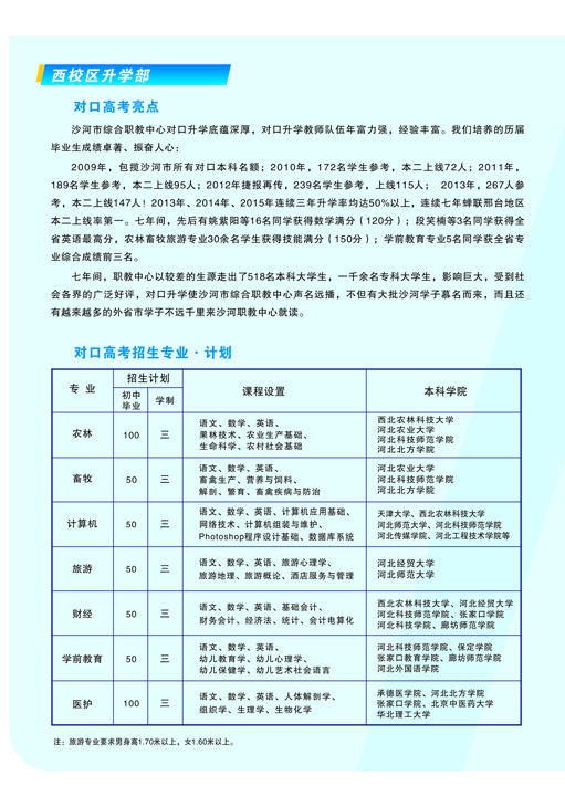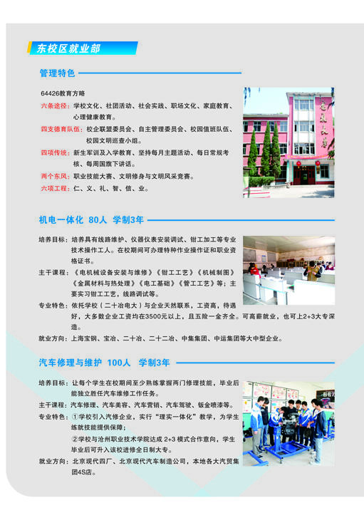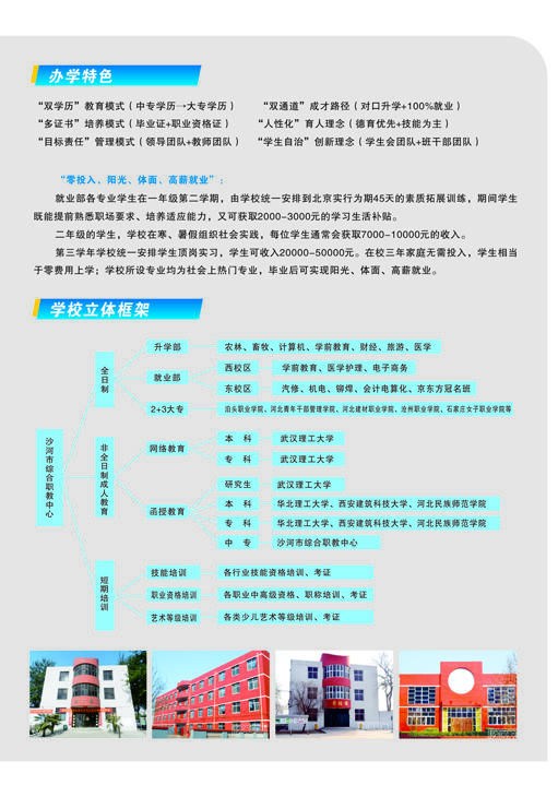 河北省沙河市綜合職教中心介紹 河北沙河市綜合職教中心始建于1995年,2011年7月沙河市人民政府將原二十冶技校(含邢臺(tái)機(jī)械電子工程學(xué)校)、原沙河市衛(wèi)生學(xué)校合并到沙河市綜合職教中心。 整合后的職教中心以“先搭建框架,再豐滿血肉”為辦學(xué)思路,通過(guò)開(kāi)展多資質(zhì)、多層次、多形式、多類別辦學(xué),逐步構(gòu)建起全日制學(xué)歷教育、成人教育和職業(yè)培訓(xùn)并舉的立體職教框架,形成了學(xué)歷教育與職業(yè)培訓(xùn)規(guī)模大體相當(dāng),全日制中職教育與成人教育規(guī)模大體相當(dāng)、升學(xué)教育與就業(yè)教育規(guī)模大體相當(dāng)?shù)霓k學(xué)格局。 河北省沙河市綜合職教中心占地99101平方米(148.6畝),分為東、西兩個(gè)校區(qū),總建筑面積為..