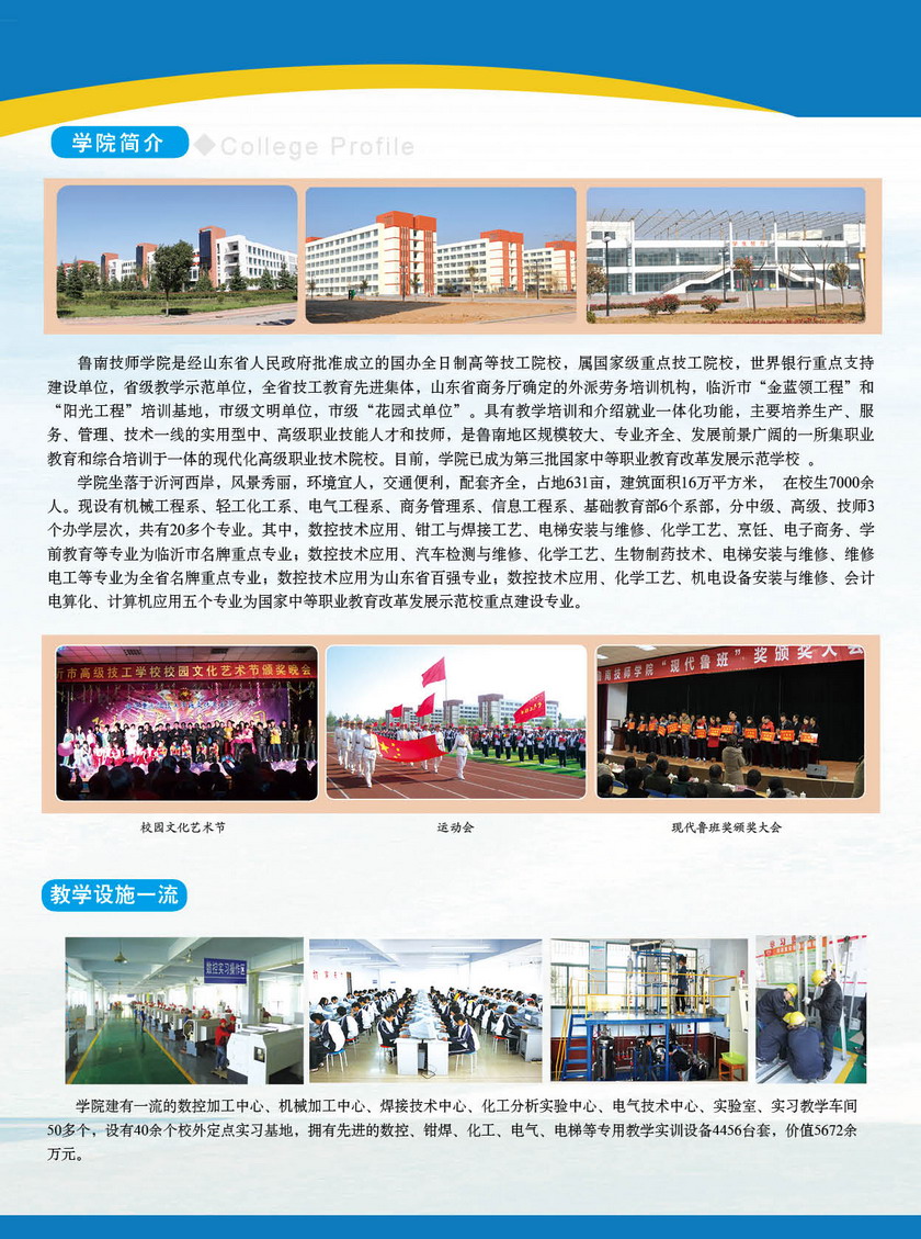 同類型學(xué)校推薦 臨沂電力學(xué)校招生簡章 山東煤炭技師學(xué)院招生簡章 山東省城市服務(wù)技師學(xué)院魯州學(xué)院招生簡章 臨沂育杰職業(yè)中等專業(yè)學(xué)校招生簡章 臨沂沂蒙國防教育基地招生簡章 一、學(xué)院簡介 魯南技師學(xué)院是國家級重點(diǎn)技工院校、國家中等教育改革發(fā)展示范學(xué)校,是一所專業(yè)齊全、發(fā)展前景廣闊的現(xiàn)代化職業(yè)技術(shù)院校。學(xué)院位于臨沂市區(qū)濱河大道與羅程路交會處,總占地面積631畝,總建筑面積16萬平方米,固定資產(chǎn)2.6億元?,F(xiàn)有專、兼職教師214人,其中:省、市首席技師12人,市級及省級專業(yè)(學(xué)科)帶頭人27人,“一體化”教學(xué)名師92人?,F(xiàn)有在校生6000余人,其中全日制在校生近5000人,成..