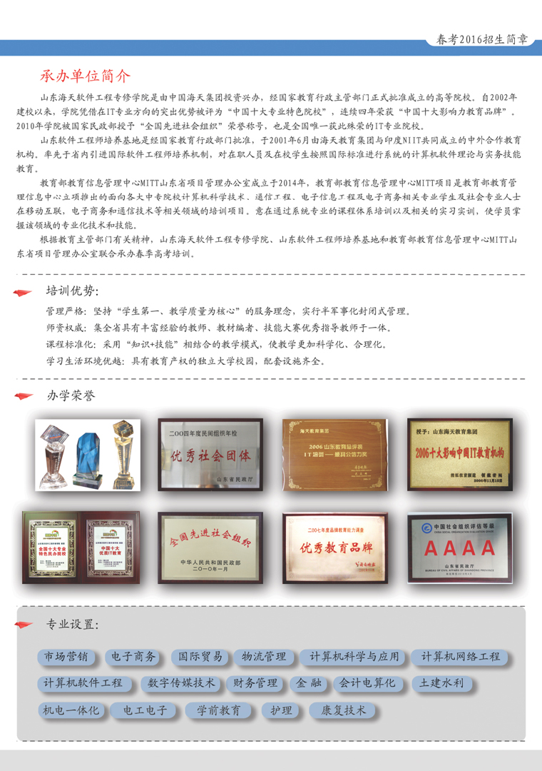 山東海天軟件工程專修學(xué)院—山東軟件工程師培養(yǎng)基地 一年學(xué)習(xí),學(xué)期短! 一年交費(fèi),費(fèi)用低! 實(shí)訓(xùn)實(shí)習(xí),免學(xué)費(fèi)! 司法公正,保四千! 山東海天軟件專修學(xué)院是一所“以IT技能為主,以高薪就業(yè)目標(biāo)的非學(xué)歷技能型”高校;山東軟件工程師培養(yǎng)基地是山東省規(guī)模大、歷史長(zhǎng)的軟件人才培養(yǎng)機(jī)構(gòu)之一。我們致力于為國(guó)家培養(yǎng)具有全球視野,掌握國(guó)際先進(jìn)IT技能的社會(huì)急需高端技術(shù)人才,并在全國(guó)首創(chuàng)“1+1+1”教育模式,采用海天獨(dú)創(chuàng)“一年學(xué)習(xí),三年培養(yǎng)”的教學(xué)體系,配合高薪就業(yè)保障體系,簽署具有司法公正的高薪就業(yè)服務(wù)協(xié)議書,真正實(shí)現(xiàn)了“技能在手,高薪就業(yè)”。 海天教育培訓(xùn)學(xué)校是由..