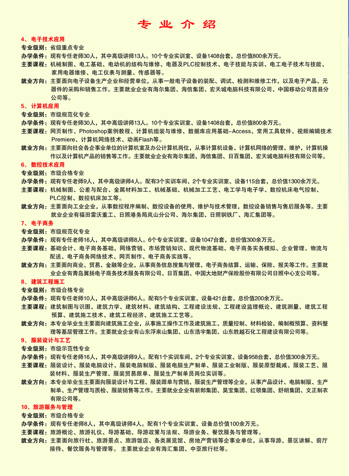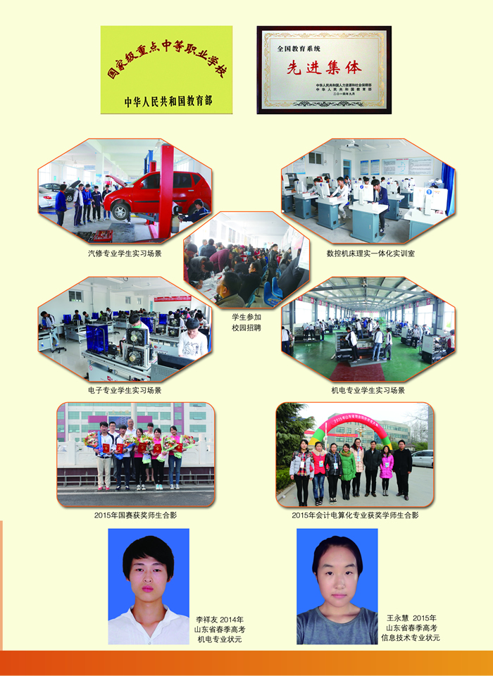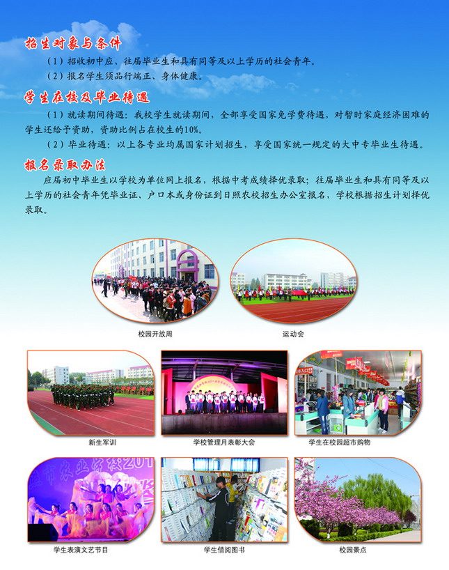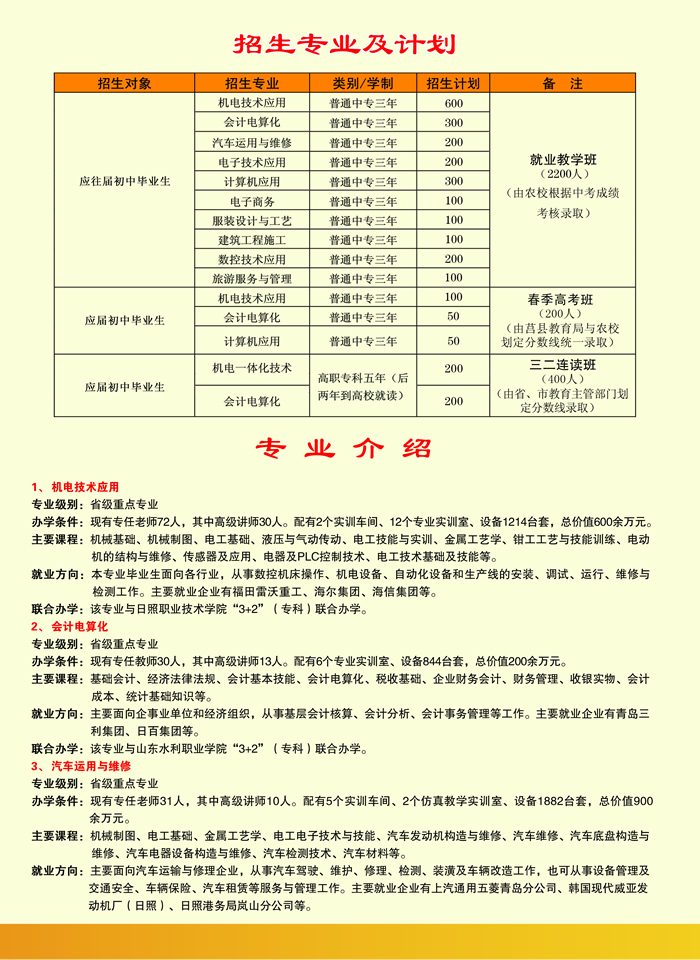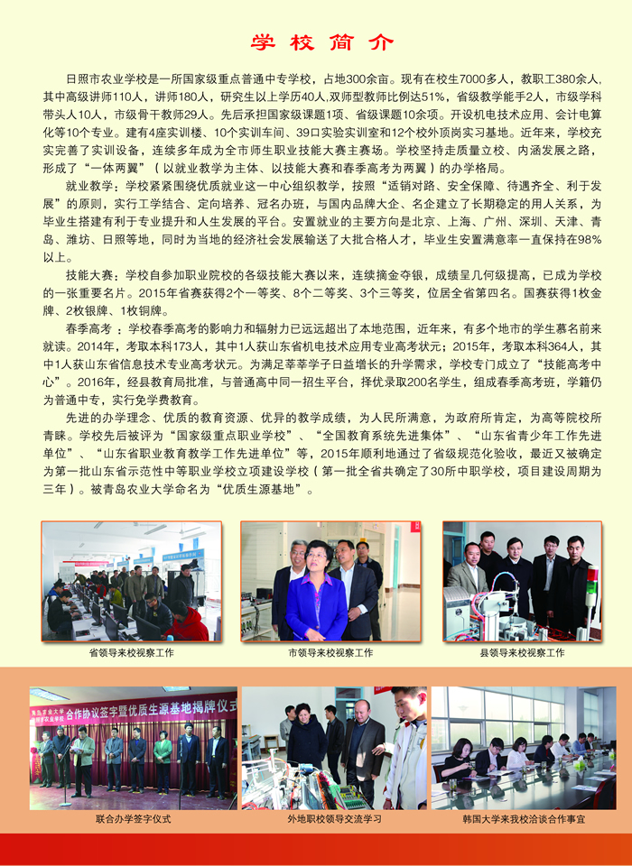 日照市農(nóng)業(yè)學(xué)校(莒縣職教中心)是日照市人民政府舉辦的一所普通中等專業(yè)學(xué)校,始建于1979年,1995年被教育部認(rèn)定為國(guó)家級(jí)重點(diǎn)職業(yè)學(xué)校,2005年被教育部確定為國(guó)家級(jí)電工電子與自動(dòng)化實(shí)訓(xùn)基地。 學(xué)校地處國(guó)家AAA級(jí)旅游區(qū)浮來(lái)山腳下,占地300畝,建筑面積8萬(wàn)平方米,在校生4000余人(其中“三二”連讀大專班學(xué)生810人),教職工450人。專任教師中碩士研究生以上學(xué)歷20人,高級(jí)職稱105人?,F(xiàn)建有1個(gè)校內(nèi)綜合實(shí)訓(xùn)車間、18口實(shí)驗(yàn)實(shí)習(xí)室和12個(gè)校外頂崗實(shí)習(xí)基地。 學(xué)校緊緊圍繞經(jīng)濟(jì)建設(shè)與社會(huì)發(fā)展,實(shí)行按需辦學(xué),定向培養(yǎng)。現(xiàn)開設(shè)9個(gè)專業(yè),其中機(jī)電技術(shù)及應(yīng)用、電子技術(shù)及應(yīng)用、計(jì)算機(jī)技..