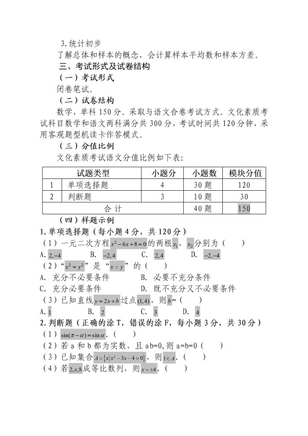 一、考試科目、時(shí)長(zhǎng)與分值 (一)考試分為文化素質(zhì)考試和職業(yè)技能考試,考試科目為四科,總分750分,閉卷筆試。 (二)文化素質(zhì)考試科目為語(yǔ)文和數(shù)學(xué)
