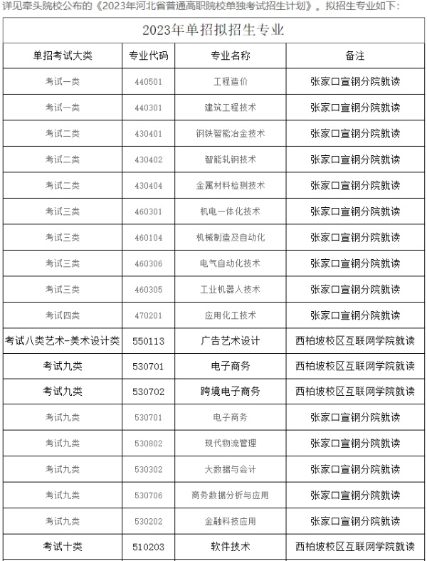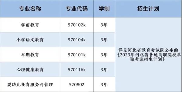 二、招生專業(yè)及計劃 2023年學(xué)院在河北單獨招生專業(yè)28個,計劃460名,以下為分專業(yè)招生計劃: 點擊查看更多單招資訊 想要了解更多單招資訊或是單招其他