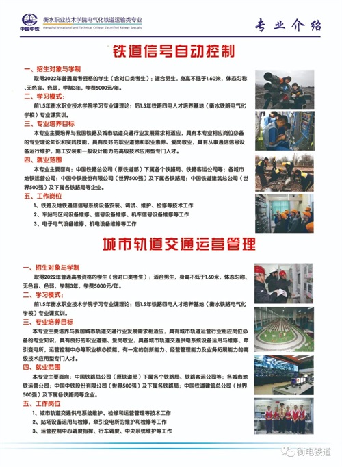 衡水職業(yè)技術(shù)學(xué)院電氣化鐵道運輸類專業(yè)是學(xué)院與中國中鐵深入校企合作、產(chǎn)教融合共建特色專業(yè),打造鐵路和軌道交通行業(yè)“文化素質(zhì)+職業(yè)技能”的新型大學(xué)生人才培養(yǎng)模式,是全國鐵路企業(yè)舉辦的電氣化鐵道運輸類專業(yè)的國家級重點職業(yè)院校,是國家電氣化鐵道運輸類和地鐵行業(yè)后備力量的主要來源,是中國電氣化鐵道運輸類高技能人才培養(yǎng)基地。學(xué)院下設(shè)"鐵道供電技術(shù)”、“鐵道信號自動控制"、城市軌道交通運營管理"、“鐵道機車運用與維護(hù)”專業(yè),具備了全日制大專學(xué)生的培養(yǎng)資格,打造鐵路及軌道交通行業(yè)"文化素質(zhì)+職業(yè)技能"的新型大學(xué)生人才培養(yǎng)模式,突出   "應(yīng)用"  與  "技能"兩個特點,在提高大學(xué)生文化素質(zhì)的基礎(chǔ)上,運用學(xué)校雄厚師資和全真鐵路"四電"及運輸專業(yè)綜合實訓(xùn)基地開展“真刀真槍"的實訓(xùn)課程.使培養(yǎng)出來的大學(xué)生不是只懂理論知識的花瓶,而是成為I正掌握實際操作技能的優(yōu)秀者。