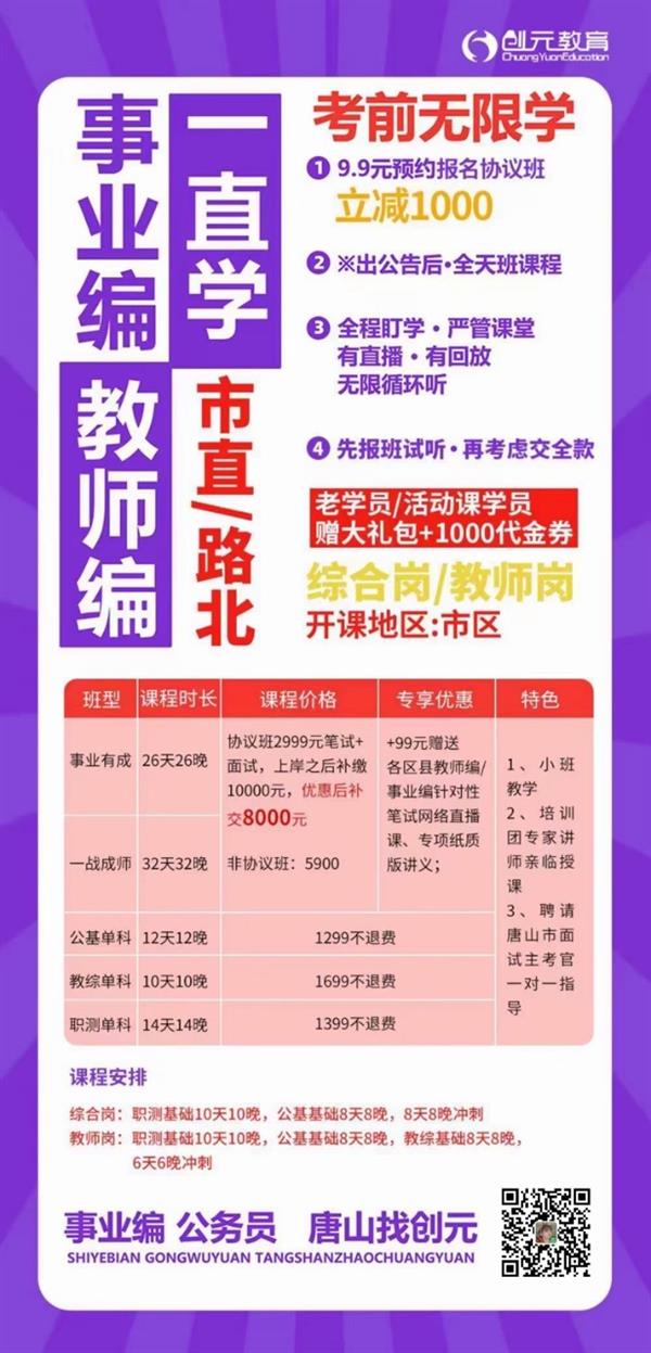 看了上述內(nèi)容,各位是否也對(duì)唐山創(chuàng)元教育教資面試班產(chǎn)生興趣了呢?除此之外,唐山創(chuàng)元教育還開(kāi)設(shè)有省考、國(guó)考、事業(yè)編等諸多課程班。各位對(duì)公務(wù)員考試感興趣的同學(xué)可以掃描下方二維碼進(jìn)行咨詢(xún)。