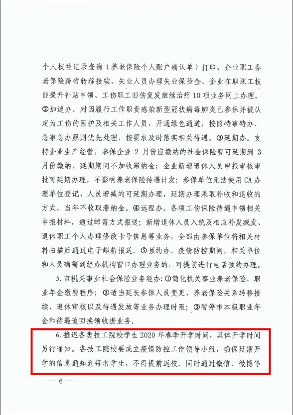 推遲各類(lèi)技工院校學(xué)生2020年春季開(kāi)學(xué)時(shí)間,具體開(kāi)學(xué)時(shí)間另行通知。各技工院校要成立疫情防控工作領(lǐng)導(dǎo)小組,確保延期開(kāi)學(xué)的信息通知到每名學(xué)生,不得提前返校。同時(shí)通過(guò)微信、微博等各種網(wǎng)絡(luò)渠道進(jìn)行假期生活提示,開(kāi)展健康教育,做好防護(hù)引導(dǎo)。
