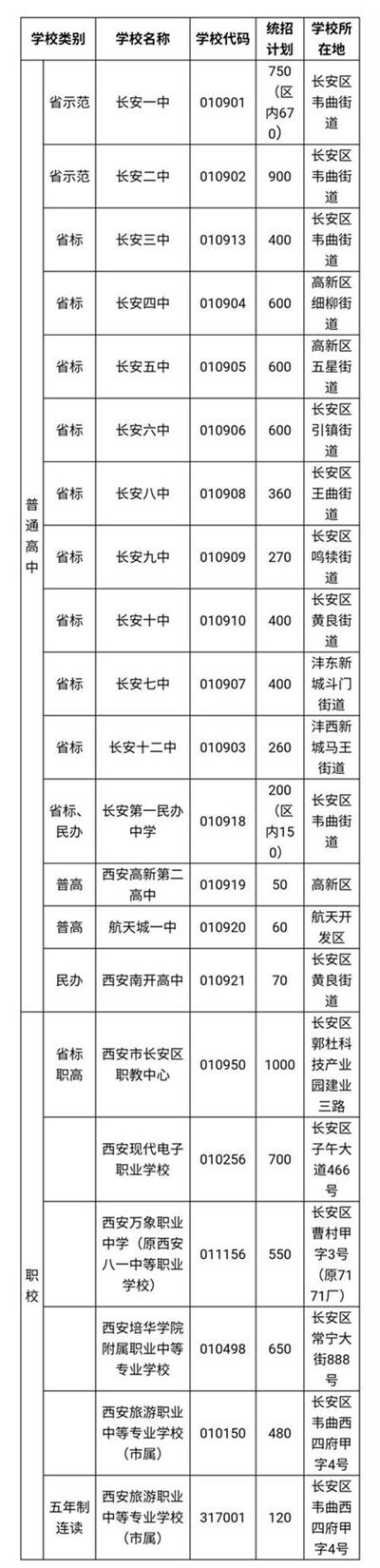 ◆ 招生計劃中,長安二中含體育特長生20人(足球10人、籃球10人)、音樂特長生8人;長安三中含體育特長生8人(足球8人);長安五中含體育特長生15人、音樂特長生7人、美術特長生8人;長安六中含體育特長生10人、音樂特長生5人、美術特長生15人;長安八中含音樂、美術特長生各5人;長安七中含體育特長生13人(僅限灃東新城所轄初中生源);高新第二高中含體育特長生5人(僅限審定合格的有關學生)。